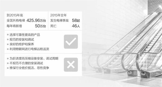 质检总局特种设备安全监察局有关负责人介绍,目前每年新增电梯达50万台以上,但安装人员的数量和能力与每年新增电梯的数量不相匹配。同时,有些项目为了进度大幅压缩设备安装、调试周期。不规范的安装作业,不合理的安装、调试周期都是影响电梯安全的因素。