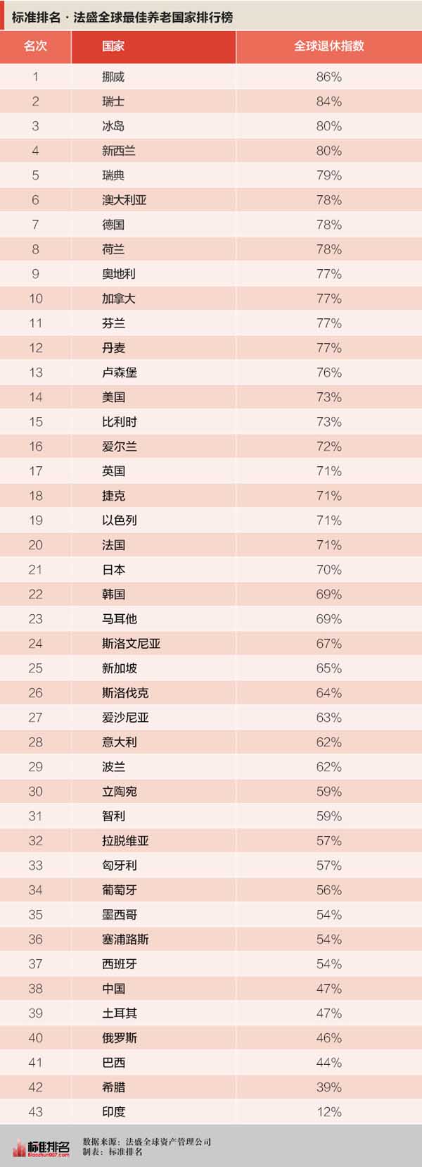 全球退休指数对提升退休保障的关键因素进行了考察,并在此基础上对43个国家的退休状况进行了分析。结果显示,挪威为全球最佳养老国家,瑞士、冰岛、新西兰和瑞典进入全球五强,分列第二至第五位。