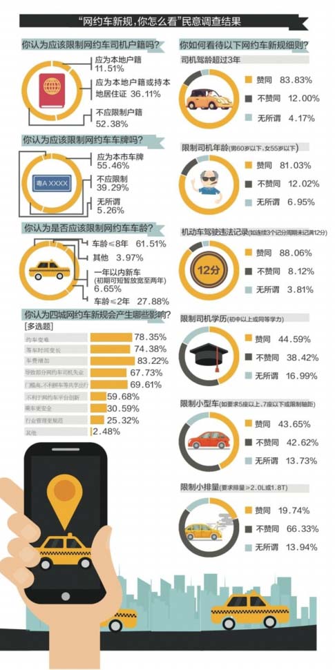 此次推出的网约车新规对司机的户籍、年龄、驾驶资质等做出不同程度要求。其中,北京、上海等要求司机为本市户籍,52.38%的网友持反对态度,有网友认为限制户籍“是对外地人的歧视”。此次北上广深四城市新规均要求网约车为“本地车牌”,超过半数网友表示支持。