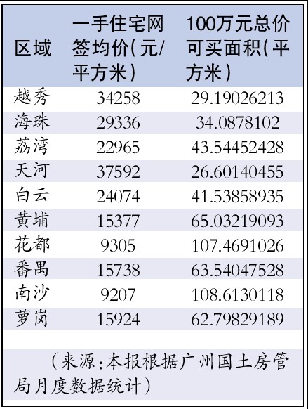 海珠、荔湾、越秀、天河、白云五个区一手住宅网签均价都已经突破2万元,天河和越秀区单价更到了“3”字头。7月本报记者曾根据上半年的数据计算,当时一名首次置业者,手中如果有30万元的首付款,以总价100万元的购房预算计算,在天河区只可以购买28.6平方米的蜗居,在越秀区可以刚好买到30.2平方米的房子,而在房价最低的花都区,还是可以买114.5平方米的大房子。