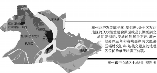 许光:对于潮州来讲,中心城区拉不大、城市框架展不开一直是影响潮州进一步发展的重要因素。由于市区面积太小,加之东部多为山地、丘陵,实际发展空间十分有限。因而,潮州市的大型产业园区、商贸物流中心、部分卫生设施、一些教育基地、拟建设的体育中心,以及高速公路、铁路和空港的站场、出入口都设在潮安县境内,造成潮州市区部分城市功能缺失。由于城区面积不大、城市功能不全和经济总量偏小,城市承载和带动能力严重不足。从城市布局看,广东省第二大河流韩江纵贯潮州,生态环境十分优越,依托韩江把潮州建设成为“一江两岸”的临海滨江城市,是潮州城市发展的最大优势。但由于韩江两岸分属湘桥区和潮安县,造成韩江两岸建设速度和景观很不协调,城市布局极不合理的现象,尤为突出的是韩江西岸已经没有建设发展空间,城市建设亟需向东拓展。