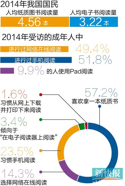 昨日,中国新闻出版研究院发布第十二次全国国民阅读调查显示,2014年我国国民人均纸质图书阅读量为4.56本,电子书阅读量为3.22本。