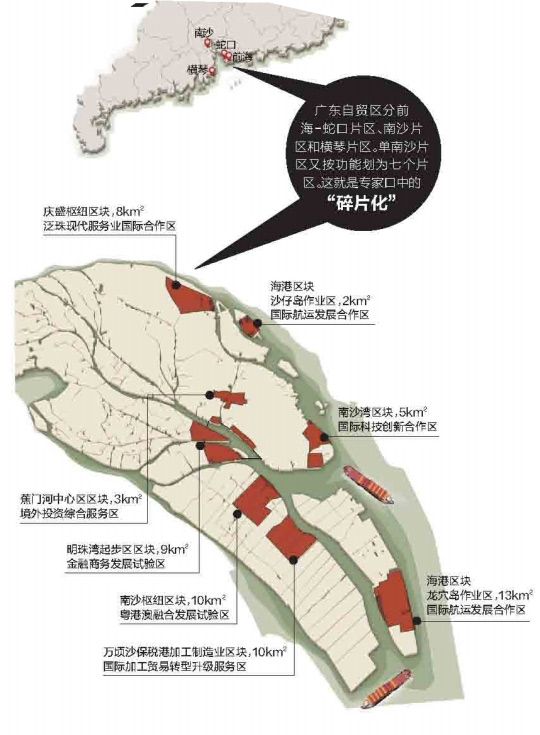 商务部内贸领域专家、广东省综合改革发展研究院院长徐印州指出,此次挂牌的广东自贸区本身有3个片区,南沙片区中又有7个小片区,其功能定位也各有不同。面对这样碎片化的自贸区模式,片区之间如何既实施统一协调的政策,又显示自己的特点是自贸区面临的首要挑战。“自贸区的发展不能‘大而全’,各片区都应突出特点,错位发展。”