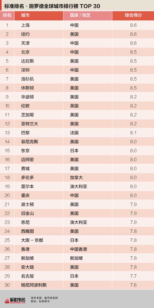 美国城市的表现也非常抢眼,在30个上榜城市中占半壁江山,除纽约和达拉斯之外,洛杉矶、休斯顿和华盛顿也都进入前十行列,分别排在第七、第八和第九位。