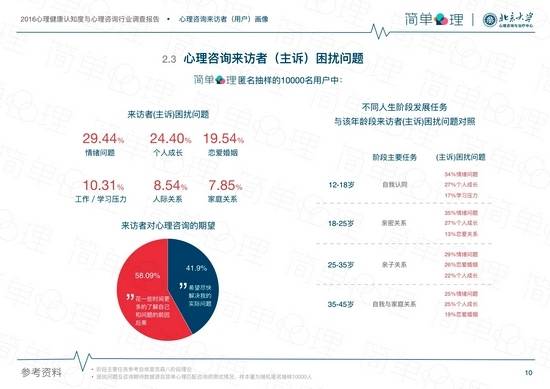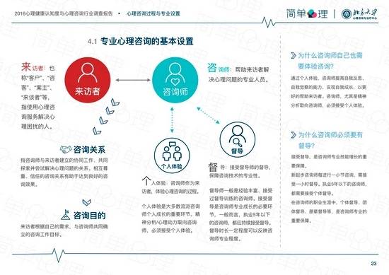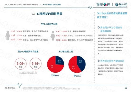 据悉,本报告参考了90年代到2016年为止的心理学学术文献276篇,调研收集样本量1291个,匿名抽样选取简单心理平台的心理咨询真实案例共计5000人、简单心理与北京大学心理咨询与治疗中心的国内顶尖心理咨询师406位,是目前我国数据规模最详实可靠、专业性极强的心理咨询业态报告。报告分为三部分,第一部分涵盖心理健康状况与心理服务概况;第二部分介绍了心理咨询的专业设置,包括咨询师资质、咨询形式、心理咨询的专业流程,并且列举了挑选专业心理咨询师的条件要点。第三部分对心理咨询进行了行业趋势分析,首次呈现国内优秀心理咨询师的群像,与来访者的用户画像。报告中分析了众多有关心理健康与心理咨询的反常识事实,例如,66.7%的受访者以消费/美食来舒缓情绪,但这种方法并不能解决根本问题,使用此方法的人群有比平均水平有更多心理困扰;海外留学生与华侨经常远程使用国内的心理咨询服务,频率甚至超过国内多数一二线城市;98.1%的受访者均面临心理困扰,88.5%面临2个以上心理困扰,然而21.5%的受访者表示不会求助,仅任由心理困扰发展。本次报告可在简单心理官网获取全文。