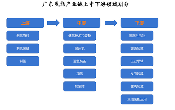 《氢能报告》中指出,广东氢能产业起步较早,围绕氢能“制、储、输、用”全产业链,已初步形成产业集聚发展态势。广东氢能产业链,主要包括上游制备、中游储运、下游应用三个部分。